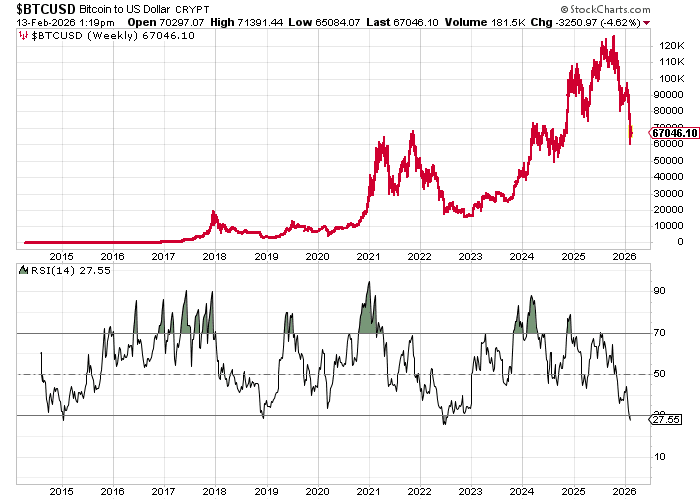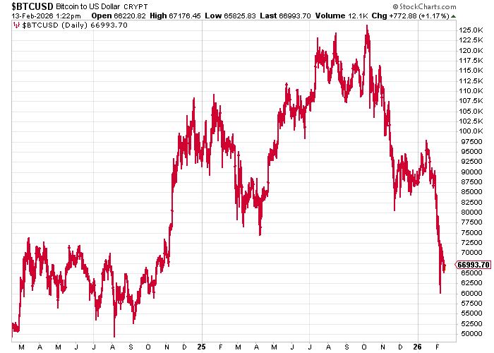 Since peaking at $126,000 in early October, the bitcoin price has been in freefall, and the declines have accelerated this year. Earlier in the week, it touched $60,000 - declines of over 50% from peak to trough. Today it sits at $67,000.