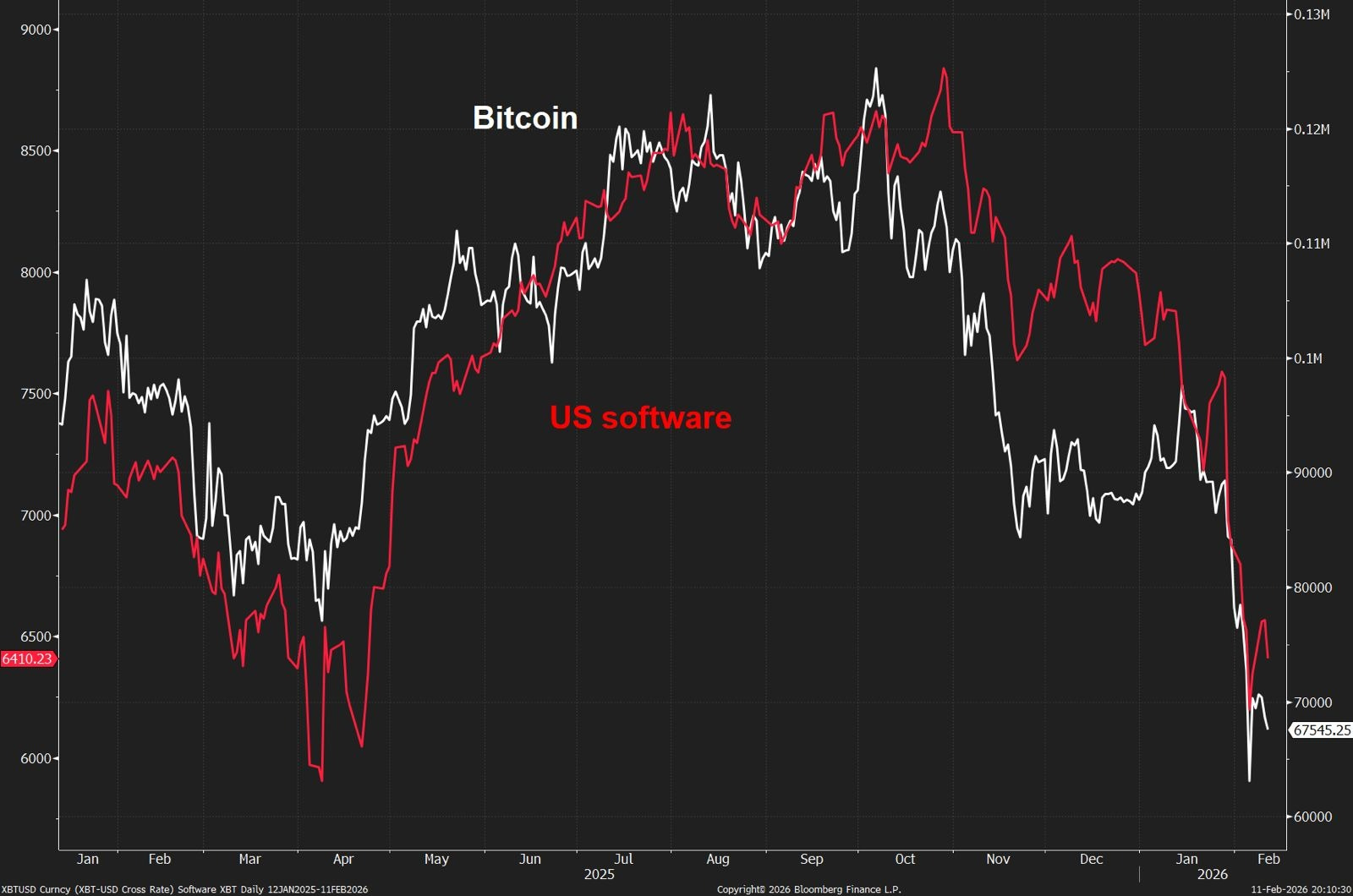The correlation is striking. As concerns around AI have hammered software more generally, bitcoin has followed.