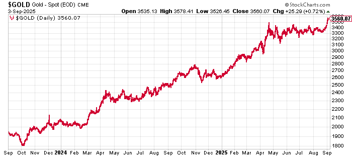Gold has broken out to new highs. As I write, it trades at $3,545/oz.