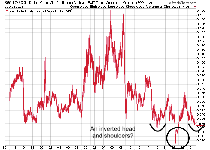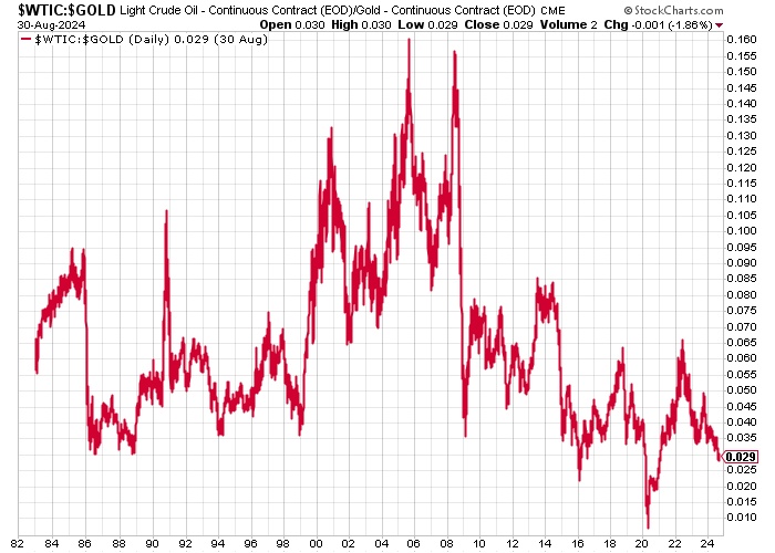 Now, we’re at 0.03 ounces of gold per barrel. Only twice since 1982 has oil been cheaper relative to gold.