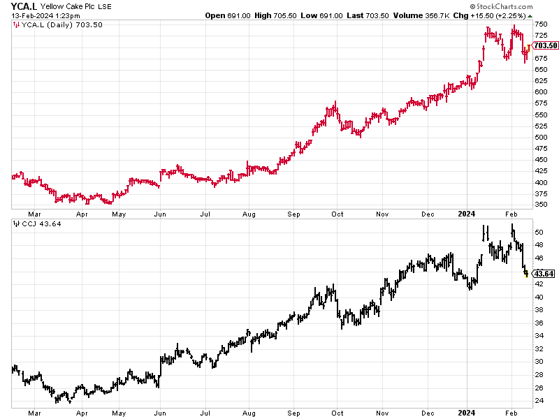 With the Cameco sell-off, the company put in an almighty double top. My pick, Yellowcake (YCA.L), did the same. (Yellowcake is in red, Cameco in black).