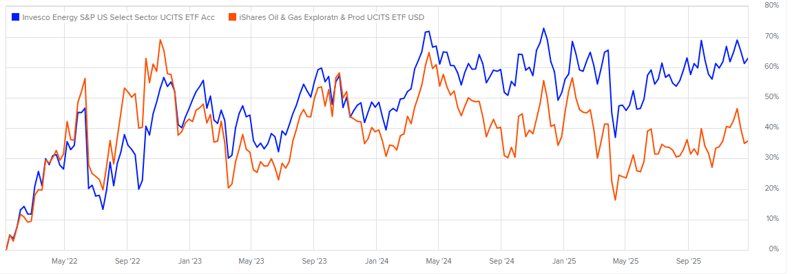 My oil and gas portfolio overall was up about 12% - being mostly allocated to the giants represented by BP (LSE:BP), Shell (LSE:SHEL), Guinness Global Energy (in the UK the ISIN is GB00B56FW078) and the Invesco Energy S&P US Select Sector UCITS ETF (LSE: XLES): all up by about by around 8-12% including dividends.