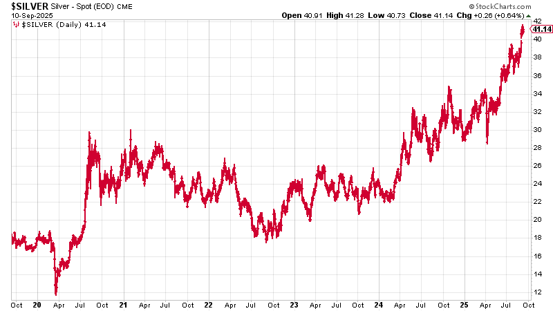 Silver is at $41. It's going great guns. I think it goes to $50. Possibly a lot higher. $200, even. But it could just as easily revisit $20.