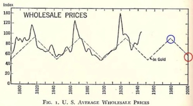 Commodities are very prone to cycles, so called secular bull markets or super-cycles. In 1947, Edward R. Dewey and Edwin F. Dakin published a book called Cycles - The Science of Predictions. It’s now out of print, but Dewey and Dakin noticed a 54-year index cycle in wholesale prices – in other words commodity prices  - going back to 1790. Based on this they made projections for the future. They called it the 54-year "Rhythm".