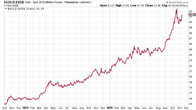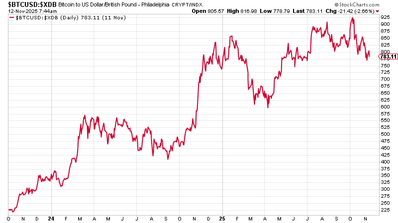 Here is bitcoin in pounds. Not as big a win as Strategy, but a 250% gain all the same.