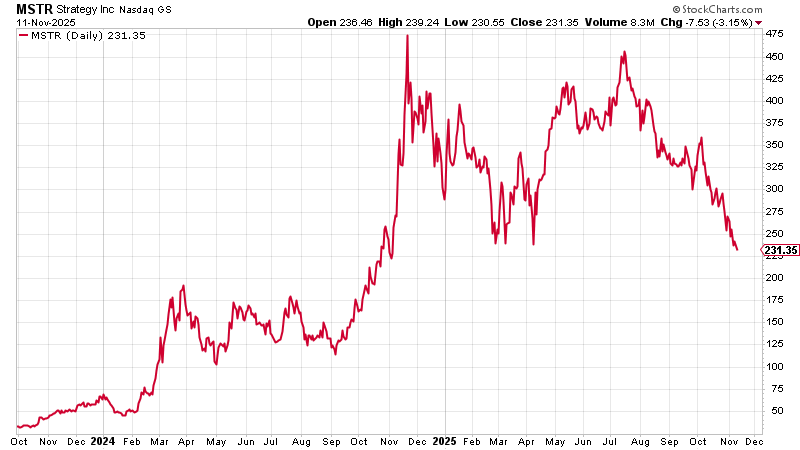 Because of issues buying bitcoin in the UK, we recommended Strategy (MSTR) as a vehicle. It was $33 and proved a total winner, more than 10x-ing, though it is in freefall now, as the heat has gone out of treasury companies.