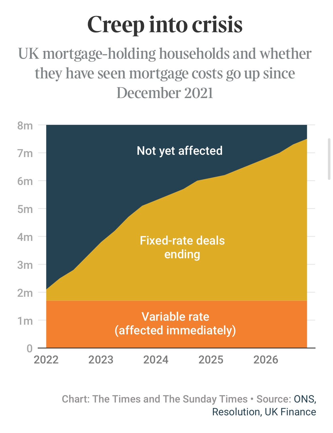Second, the sheer number of fixed deals that are coming up for renewal in the next couple of years. This will see something in the region of two million households faced with mortgage repayments of at least double the level they were when the original deal was taken out (see below chart). Many are not going to be able to meet those repayments. The Office for National Statistics (ONS) says 57% of UK fixed rate mortgages were fixed below 2%. Forced sellers will quickly drive down prices.