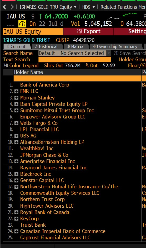 Here’s a list of the biggest holders of the iShares gold ETF. Many of banking’s biggest names are there.