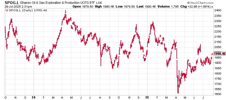 The iShares Oil and Gas ETF (SPOG.L) - North American oil and gas companies, basically - is my primary vehicle by which to play this. It’s off a little, but it’s outperformed oil itself.