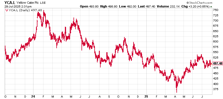 Yellowcake (YCA.L) is our vehicle. We reduced around 700p in February 2024. It’s now 500p