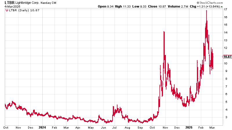 By the way, check out this nuts Lightbridge chart. The bots must have got hold of it. Surely one be one to buy on the dips and exit on the spikes.