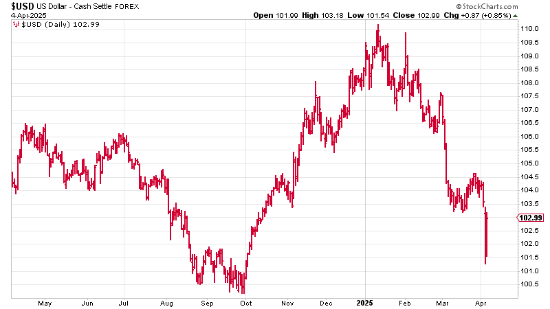 Second, it needs a cheaper dollar. A weaker dollar will encourage investment and relocation from overseas (it makes the US cheaper). That’s happening too. Indeed, what was so unique about this week’s panic is that the dollar—usually the first port of call in a financial storm—didn’t rise (at least not at first). Here is the US dollar index. It’s coming down. It’s already down almost 10% from its highs. That means America just got 10% cheaper to invest in. A move back to the low 90s, or even below, would be ideal.