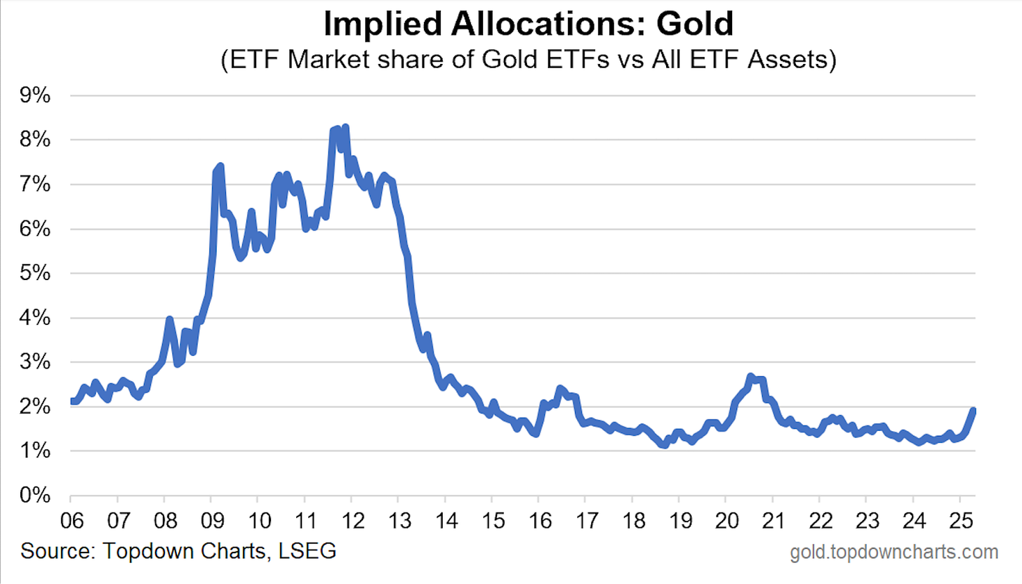 Portfolios are roughly 2% allocated to gold at present. They were four times that at the peak of the last bull market in 2011.