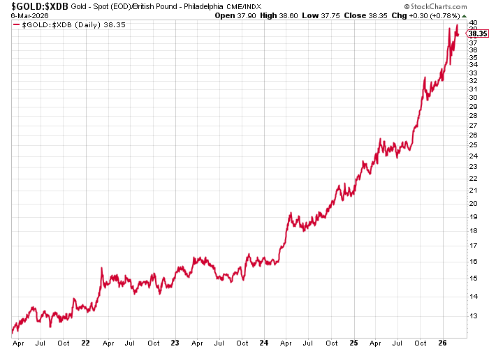 Here’s a five-year chart of gold priced in pounds, in case you were wondering what a trend looks like. There’s only one way this is going.