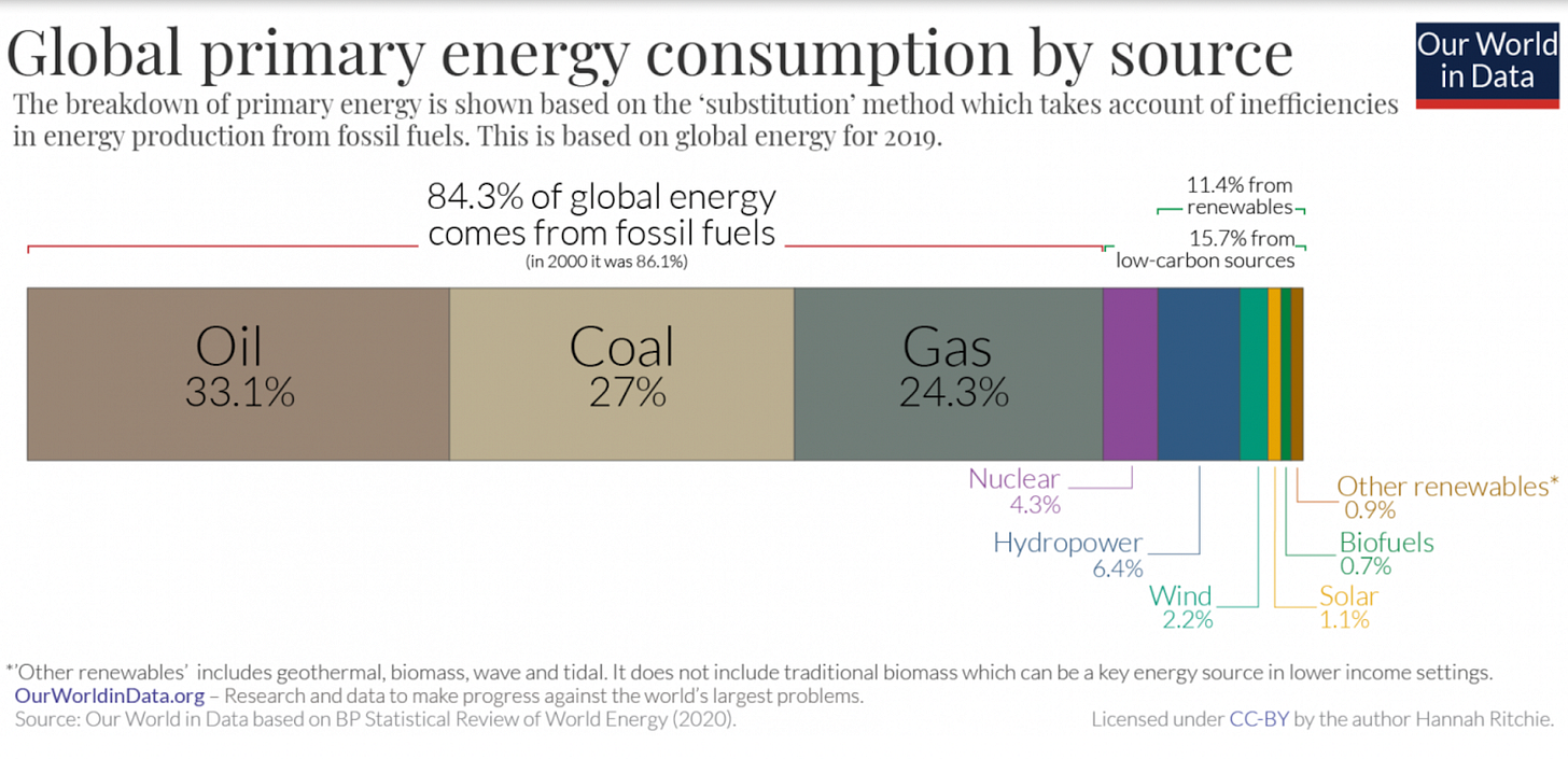 At this point it’s worth reminding ourselves that there are, around the world, three main areas of energy consumption - transportation, heating and electricity. While cleaner forms of energy, such as nuclear or wind, might be increasing as sources of electricity, 84% of global energy still derives from the burning of fossil fuels, as the graphic below from Our World In data shows.