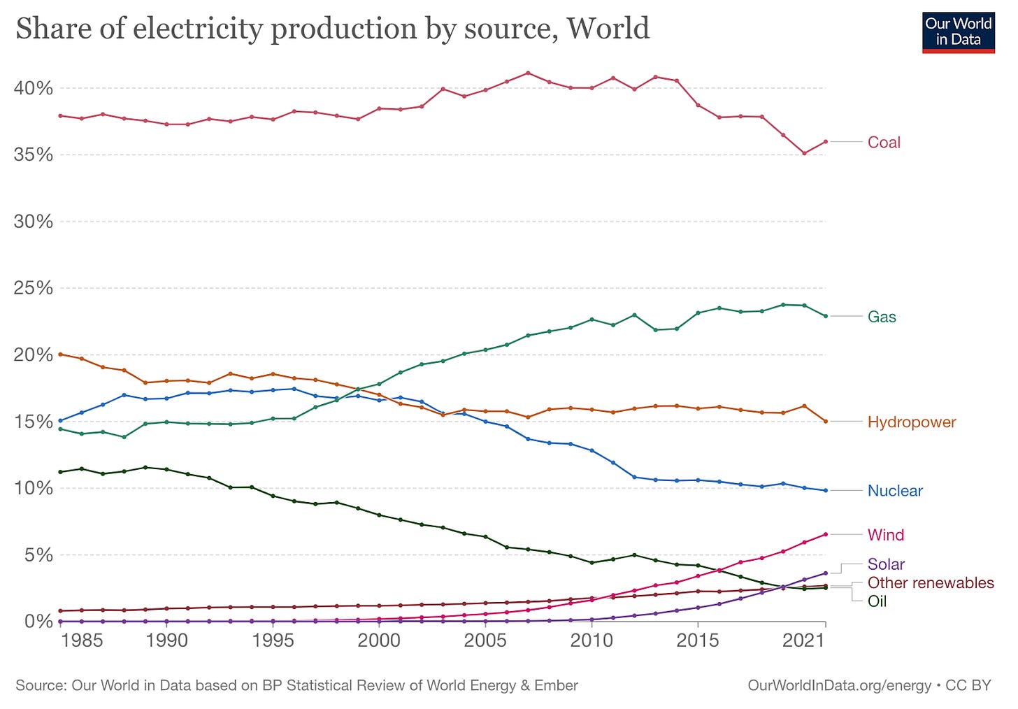 Even electricity, despite its green credentials, still relies on fossil fuels. The burning of the fossil fuel may be out of sight and, therefore, out of mind, but over 60% of global electricity still derives from it, as our second graphic shows.