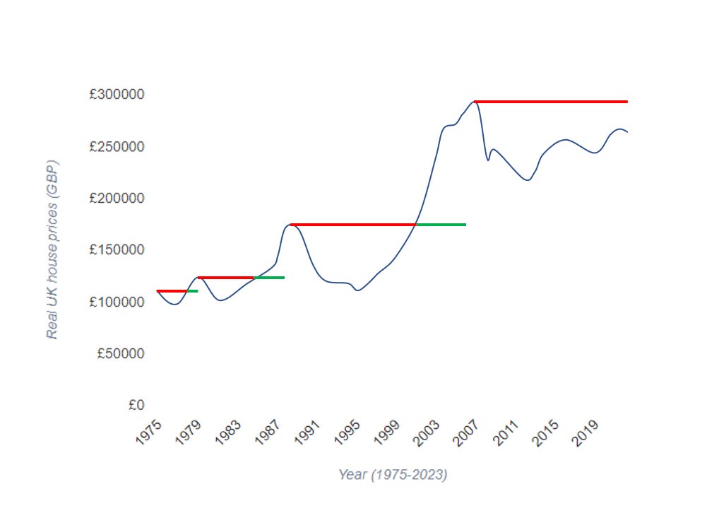 And the second spoiler? Let’s look at this chart of real UK house prices. We have a situation where, in real terms, an asset went from around £100,000 to £250,000 over almost 50 years. (In nominal terms, housing went up by more: it’s one of the few ways by which ordinary people have been able to get exposure to money supply growth).